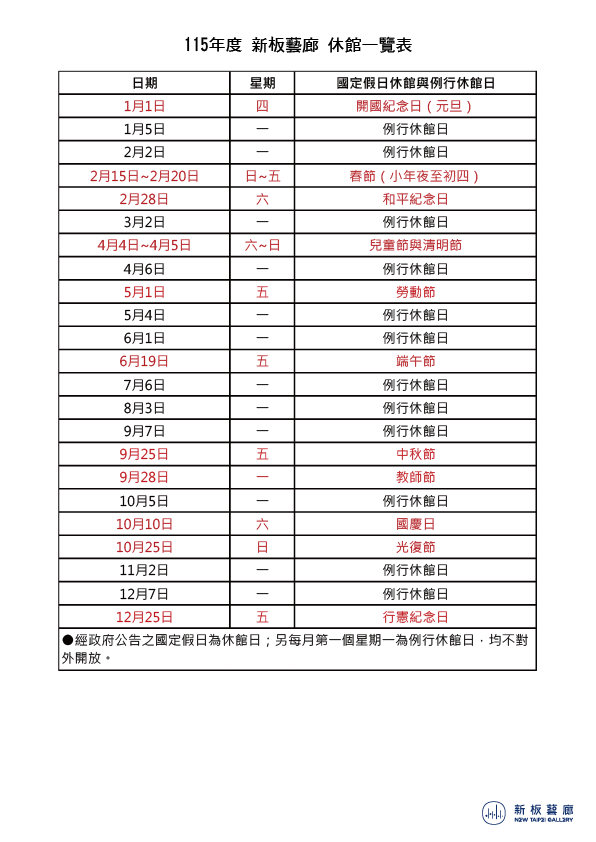 每月第一個星期一、國定假日、政府公告之天然災害停止上班日,其他必要之休館日將另行公告。